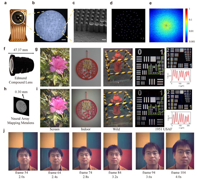 图2、神经阵列超构透镜成像系统成像性能测试。(a)原型机;(b)光学显微图;(c)扫描电子显微图;(d)系统的点扩散函数。(e)系统的MTF;(f)Edmund复合透镜。(g)使用Edmund复合透镜相机拍摄显示屏、室内场景、室外场景及分辨率测试图的成像效果。(h)神经阵列超构透镜成像系示意;(i)神经阵列超构透镜成像系统在相同条件下拍摄的图像;(j)实时视频成像过程中捕获的六帧序列及对应时间。